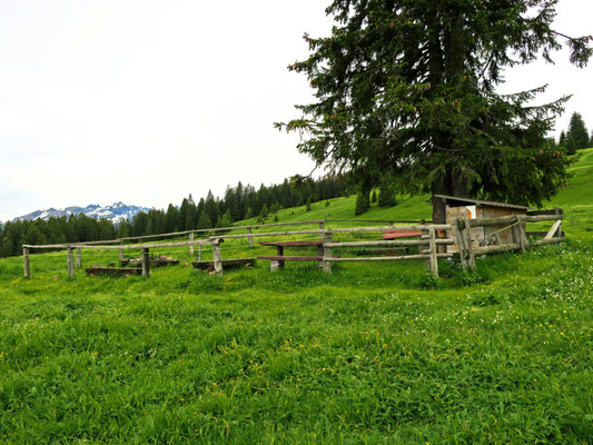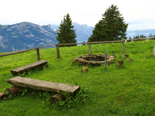 Diese Feuerstelle ist mitten auf einer Wiese hoch über dem Walensee angelegt. Es gibt ein paar Bänke und einen Tisch, Holz ist ebenfalls zu Verfügung gestellt. Bei Flugwetter kann man von hier Gleitschirmpilotinnen und -piloten beim Startmanöver beobachten.