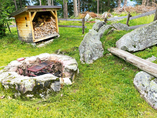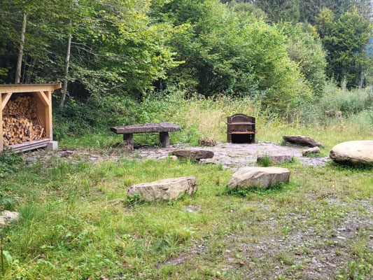 Die Feuerstelle liegt etwas versteckt abseits der Strasse, ist aber mit einem Wegweiser gut markiert. Die Steinblöcke und der Holzzaun machen den Ort sehr gemütlich. Holz, Herd und Rost sind vorhanden, für alles andere muss eigenständig gesorgt werden.
